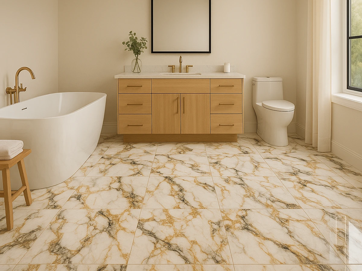 This glossy porcelain floor brings the timeless allure of marble into a modern setting. Grey veining and golden accents create a subtle drama that elevates everything from sculptural lighting to velvet seating. More than a surface, it becomes the element that gives your home its refined, gallery-like atmosphere.